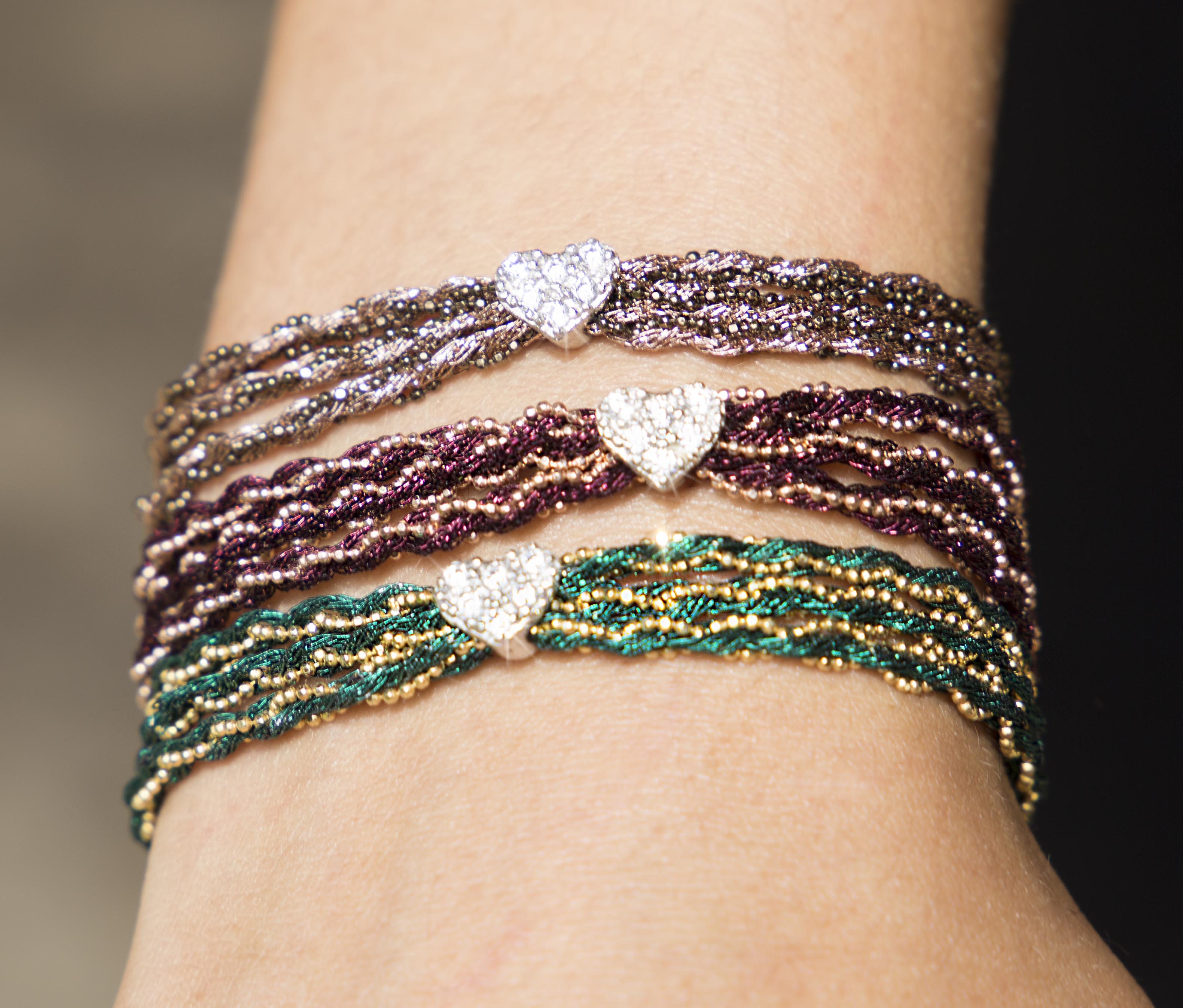 BRACCIALE composto da seta intrecciata con catena diamantata a pallini, framezzo a forma di cuore con zirconi e componenti in Ag.925